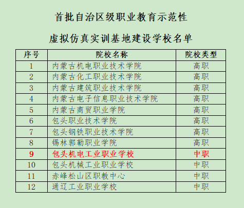 近日,自治区教育厅公布了首批自治区级职业教育示范性虚拟仿真实训基地建设学校名单,其中高职院校8所,中职学校4所,包头机电工业职业学校榜上有名。